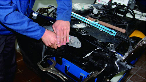 在鋁質面板修復時,也可使用鋁整形機對損傷部位進行拉伸修復,在經整形機修復到位后,使用專用工具將螺紋介子齊根剪下,再打磨平整即可。對于鋼板車身來說,當面板和內層結構同時發生變形時,可以采取內外層分離、分別修整,然后折邊咬合的修復方法。對于鋁質面板,不能使用這種方法,否則由于鋁的韌度較差,折邊部位會出現裂紋或斷裂。