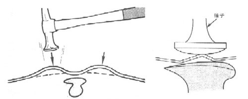(1)為了降低拱起部位的高度,如果采用正托敲擊法,操作時應多次輕敲,不能重敲,否則錘擊太重或次數過多會使鋁板延展拉伸,如圖1-89所示是正托敲擊法示意圖。