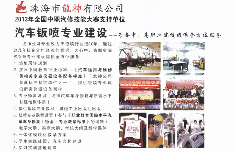 “龍神杯”2013年河南省中職學校汽車專業技能涂裝項目大賽 3月22日,2013年河南省中職學校汽車專業建設-校企合作專家論壇暨2013年汽車專業技能大賽開幕,珠海市龍神有限公司王先生出席開幕式并演講“龍神鈑金一往情深”。在本次大賽中龍神系列產品做了高率、環保有力的保障了賽事的進程,同時也受到了參賽學校的一致好評。 3月24日,“龍神杯”2013年河南省中職學校汽車專業技能涂裝項目大賽圓滿結束。