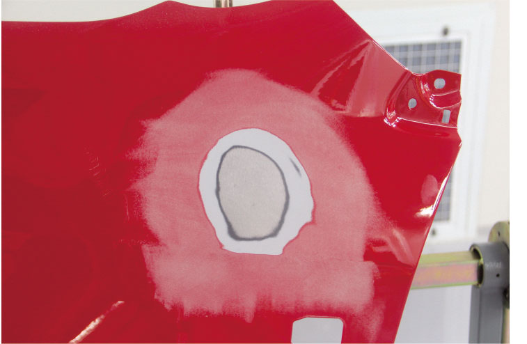 3. 施涂打磨指示劑后對原子灰區(qū)域進行中間過渡打磨。